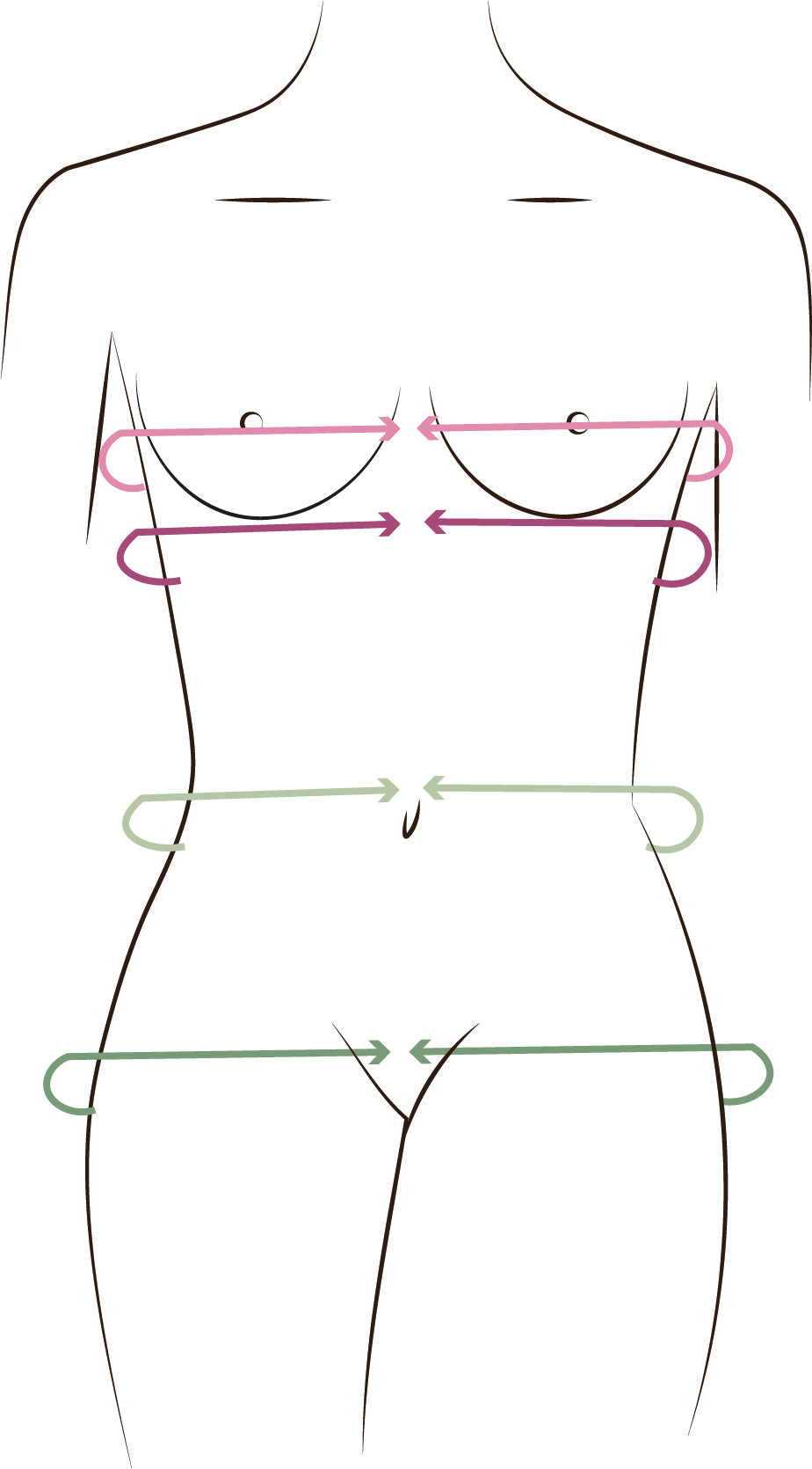 Tour de sous-poitrine : Placez votre mètre ruban dans votre dos, bien parallèle au sol, et faites-le passer sous la poitrine, là où repose habituellement un soutien-gorge.